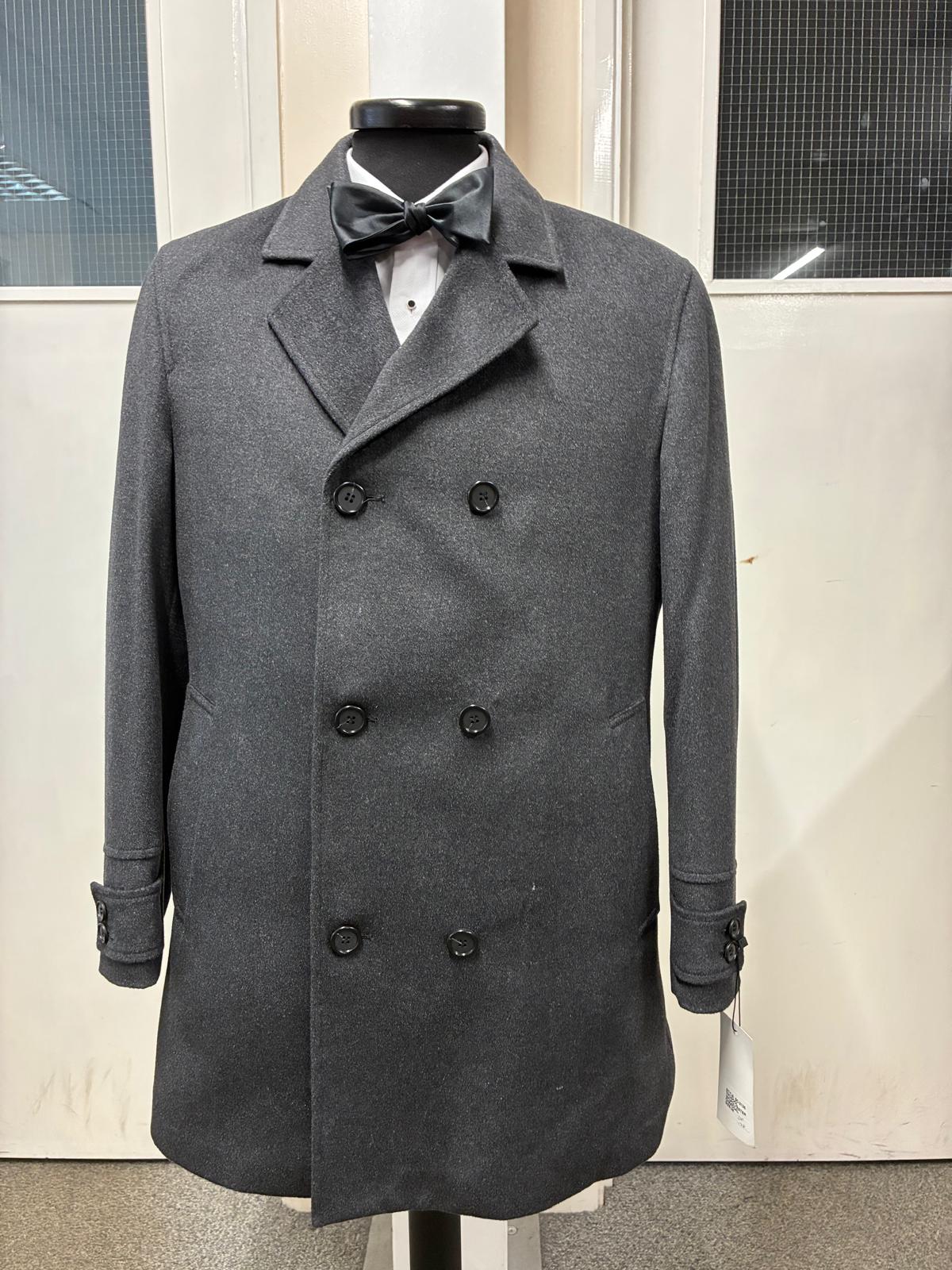 6 button reefer coat shown in charcoal is also available in black and navy.
